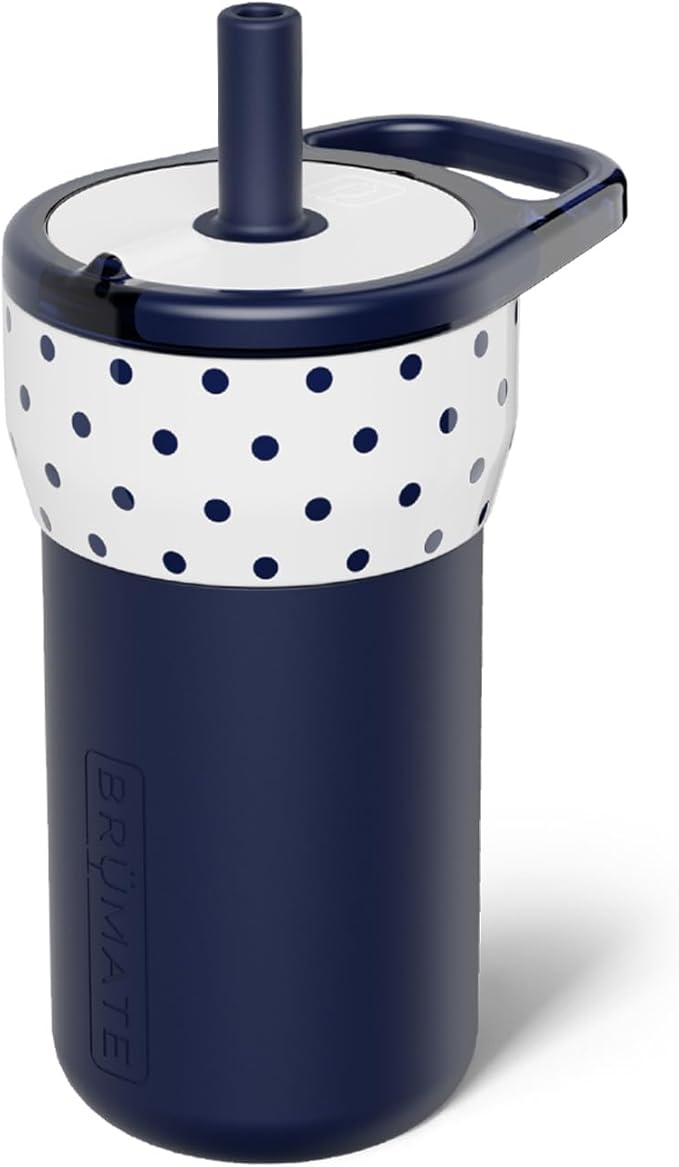 BrüMate Leap 12oz 100% Leakproof Kids Tumbler with Handle & Silicone Soft Straw | Durable Drop Resistant Silicone Sleeve | Made of Insulated Stainless Steel | Cup Holder Friendly | (White Polka Dots)