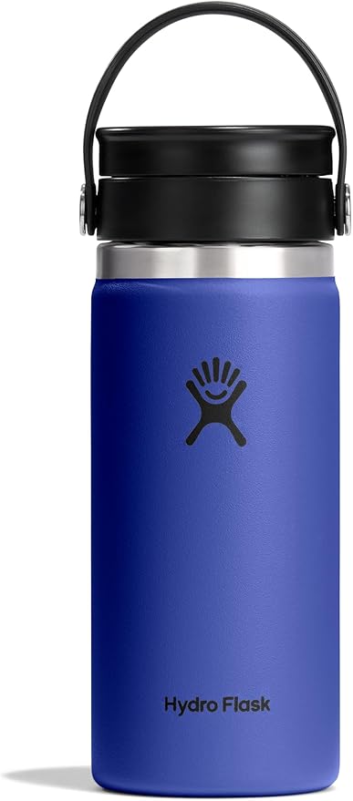 - 16 OZ CAPRI BLUE FLEX SIP BOTTLE: Designed for hot drinks, Hydro Flask's insulated Wide Mouth water bottle with Flex Sip Lid is cupholder compatible and leakproof. This insulated, stainless steel bottle is ideal for coffee or tea, keeping hot drinks hot and cold drinks cold.